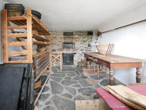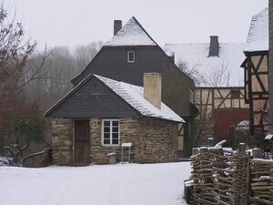 Während Wintermonate 1997/98 wurde im Freilichtmuseum das Backhaus aus Oberkleinich im Kreis Bernkastel-Wittlich wiederaufgebaut. Es handelt sich um ein kleines einstöckiges Schieferbruchsteingebäude. Das Innere besteht nur aus einem Raum, dessen hinteres Drittel der Backofen einnimmt. Ursprünglich gehörte es fünf Backgenossen, die es 1932 in Eigenleistung erbauten. Der Neubau war notwendig geworden, als in der Nachbarschaft das Backhaus von Adolf Weirich abgerissen werden mußte. Dieser hatte 1928 ein neues Wohnhaus errichtet, worauf der Rauch seines alten Backhauses ständig in die Räume des 1. Stockwerks zog. Als sich seine Nachbarn bereit erklärten, sich an einem Neubau zu beteiligen, wurde der Bau schließlich 1932 in Angriff genommen. Während die Beweggründe Adolf Weirichs eher praktischer Natur waren, wirft die Entscheidung seiner Nachbarn, sich zu beteiligen, ein interessantes Licht auf den wirtschaftlichen und kulturellen Wandel, der den Vorderen Hunsrück in den frühen 30er Jahren ergriff. Das Beispiel Edmund Meurers aus Oberkleinich belegt dies eindeutig. Wie in den meisten Bauernhäusern befand sich in seiner Küche in den 20er Jahren noch die eine offene Feuerstelle. In dieser Zeit setzten sich erst allmählich gemauerte Sparherde oder gußeiserne Herde durch. Waren die Küchen bisher rußige dunkle Räume gewesen, aus denen sich im ganzen Haus der Geruch nach brennendem Feuer verbreitete und wo sich unweigerlich immer wieder eine Rußschicht auf alle Gegenstände legte, so wurde der Rauch nun durch ein Ofenrohr in den Schornstein gelenkt und über das Dach abgeleitet. Nur beim Brotbacken entstand immer wieder Schmutz, denn im Kleinicher Kirchspiel war der Backofen häufig an das Haus angebaut, so daß er von der Küche aus beschickt werden konnte. Um die Küche endgültig zu einem rauchfreien Wohnraum zu machen, schloß er sich der neuen Backgemeinschaft an. Der alte Backofen wurde stillgelegt und schließlich abgerissen. Durch die Verbannung von offenem Feuer und Rauch aus der Küche verlor diese ihren Charakter als reiner Arbeitsraum. Sie wurde zur Wohnküche, wodurch die Verwandlung der bisherigen Wohnstube zum Wohnzimmer erst möglich wurde. Mit dem Wandel der Raumfunktion erlebte das ganze Haus und damit das Alltagsleben in ihm eine grundlegende Veränderung. Das Wohnen bekam von nun an eine neue Qualität. Es ist eine Ironie des Schicksals, daß sich dieser Wandel gerade in einer Zeit vollzog, die durch Wirtschaftskrise, hohe Arbeitslosenzahlen und Not geprägt war. Dem Gebäude merkt man denn auch an, daß es nicht in Zeiten des Überflusses gebaut wurde. Beim Abbau stellte sich heraus, daß nicht nur die Ofensteine des abgerissenen Backhauses für das Mauerwerk verwendet wurden, sondern auch zerbrochene Sandsteintröge und anderes Abfallgestein. Die Ofenwand besteht teils aus Schiefer-, teils aus Ziegel- und Bimssteinen. Das Herz des Backhauses, der Backofen, wurde jedoch auch in dieser Zeit von Fachleuten errichtet: von der Backofenbauerfirma Edmund Frey aus Bell in der Eifel. Auch der Aufbau des Backofens im Museum wurde von einer Beller Firma durchgeführt. Die Firma Hermann Heufft setzte als einziger verbliebener Betrieb des ehemaligen Backofenbauerdorfes den Ofen im Mai 1998, damit das Backhaus bei der Festveranstaltung zum 25. Museumsgeburtstags am 12. Juni 1998 eingeweiht werden konnte.
