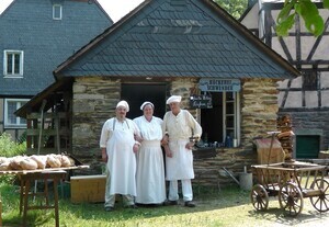 Während Wintermonate 1997/98 wurde im Freilichtmuseum das Backhaus aus Oberkleinich im Kreis Bernkastel-Wittlich wiederaufgebaut. Es handelt sich um ein kleines einstöckiges Schieferbruchsteingebäude. Das Innere besteht nur aus einem Raum, dessen hinteres Drittel der Backofen einnimmt. Ursprünglich gehörte es fünf Backgenossen, die es 1932 in Eigenleistung erbauten. Der Neubau war notwendig geworden, als in der Nachbarschaft das Backhaus von Adolf Weirich abgerissen werden mußte. Dieser hatte 1928 ein neues Wohnhaus errichtet, worauf der Rauch seines alten Backhauses ständig in die Räume des 1. Stockwerks zog. Als sich seine Nachbarn bereit erklärten, sich an einem Neubau zu beteiligen, wurde der Bau schließlich 1932 in Angriff genommen. Während die Beweggründe Adolf Weirichs eher praktischer Natur waren, wirft die Entscheidung seiner Nachbarn, sich zu beteiligen, ein interessantes Licht auf den wirtschaftlichen und kulturellen Wandel, der den Vorderen Hunsrück in den frühen 30er Jahren ergriff. Das Beispiel Edmund Meurers aus Oberkleinich belegt dies eindeutig. Wie in den meisten Bauernhäusern befand sich in seiner Küche in den 20er Jahren noch die eine offene Feuerstelle. In dieser Zeit setzten sich erst allmählich gemauerte Sparherde oder gußeiserne Herde durch. Waren die Küchen bisher rußige dunkle Räume gewesen, aus denen sich im ganzen Haus der Geruch nach brennendem Feuer verbreitete und wo sich unweigerlich immer wieder eine Rußschicht auf alle Gegenstände legte, so wurde der Rauch nun durch ein Ofenrohr in den Schornstein gelenkt und über das Dach abgeleitet. Nur beim Brotbacken entstand immer wieder Schmutz, denn im Kleinicher Kirchspiel war der Backofen häufig an das Haus angebaut, so daß er von der Küche aus beschickt werden konnte. Um die Küche endgültig zu einem rauchfreien Wohnraum zu machen, schloß er sich der neuen Backgemeinschaft an. Der alte Backofen wurde stillgelegt und schließlich abgerissen. Durch die Verbannung von offenem Feuer und Rauch aus der Küche verlor diese ihren Charakter als reiner Arbeitsraum. Sie wurde zur Wohnküche, wodurch die Verwandlung der bisherigen Wohnstube zum Wohnzimmer erst möglich wurde. Mit dem Wandel der Raumfunktion erlebte das ganze Haus und damit das Alltagsleben in ihm eine grundlegende Veränderung. Das Wohnen bekam von nun an eine neue Qualität. Es ist eine Ironie des Schicksals, daß sich dieser Wandel gerade in einer Zeit vollzog, die durch Wirtschaftskrise, hohe Arbeitslosenzahlen und Not geprägt war. Dem Gebäude merkt man denn auch an, daß es nicht in Zeiten des Überflusses gebaut wurde. Beim Abbau stellte sich heraus, daß nicht nur die Ofensteine des abgerissenen Backhauses für das Mauerwerk verwendet wurden, sondern auch zerbrochene Sandsteintröge und anderes Abfallgestein. Die Ofenwand besteht teils aus Schiefer-, teils aus Ziegel- und Bimssteinen. Das Herz des Backhauses, der Backofen, wurde jedoch auch in dieser Zeit von Fachleuten errichtet: von der Backofenbauerfirma Edmund Frey aus Bell in der Eifel. Auch der Aufbau des Backofens im Museum wurde von einer Beller Firma durchgeführt. Die Firma Hermann Heufft setzte als einziger verbliebener Betrieb des ehemaligen Backofenbauerdorfes den Ofen im Mai 1998, damit das Backhaus bei der Festveranstaltung zum 25. Museumsgeburtstags am 12. Juni 1998 eingeweiht werden konnte.