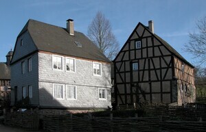 Erbaut: um 1820 Erweitert: 1848 Abgebaut: 1980 Wiedererrichtet: 1981/82 (Rhein-Hunsrück-Kreis) Das um 1820 erbaute bäuerliche Wohnhaus aus Bell zeigt ein für den Hunsrück typisches Erscheinungsbild Es wurde als zweigeschossiges zweiraumtiefes Fachwerkhaus errichtet, dessen gesamter Wohnteil mit Naturschiefer verkleidet ist. Links vom Wohnhaus befindet sich ein Stallanbau aus Schiefersteinen von 1848, in dem im Museum moderne Toilettenanlagen eingebaut wurden. Der Hausname "Sensemichel" geht auf Peter Michel zurück, der im Urkataster von 1831 als Hausbesitzer eingetragen ist. Er hatte den Spitznamen "Sensemichel", weil es seinerzeit vier Personen mit dem gleichen Namen in Bell gab. Der Name wurde zum Hausnamen, nach dem fortan alle seine Bewohner gerufen wurden. Viel mehr wissen wir leider nicht über die Geschichte dieses stattlichen Hauses. Im Museum ist im Erdgeschoß die Gaststube einer Dorfwirtschaft eingerichtet, die bei Aktionstagen und bei "Lebender Geschichte" als solche benutzt werden kann. Der erste Stock des Hauses wurde zu einer modernen Wohnung ausgebaut und ist als Wohnung vermietet. Dies hilft nicht nur das Museum zu finanzieren, sonder verhindert weitgehend nächtlichen Vandalismus.