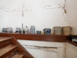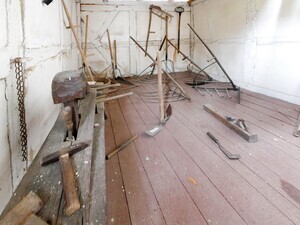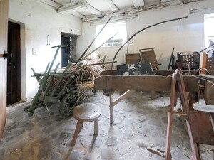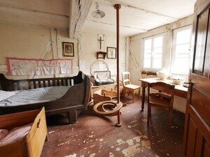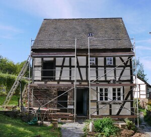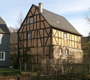 Erbaut: 2. Hälfte des 18 Jhdts. Abgebaut: 1980 Wiedererrichtet: 1986 (Kreis Cochem-Zell) Das Bild zeigt das Hirtenhaus aus Lieg, das den Hausnamen "Kläsjeshaus" trägt. Zweistöckiges, zweiraumtiefes Wohn-Stall-Haus, Wohnteil aus Fachwerk, Stallteil aus Schieferbruchsteinen. Das schlichte Fachwerkgebäude war bis 1845 das Schweinehirtenhaus der Gemeinde Lieg. Das Fachwerk wurde vollständig mit zweitverwendetem Holz erbaut. 1857 wurde es an den Schneider Johannes Nikolaus Wickert ("Kläsje") verkauft, auf den sich wahrscheinlich der Hausname bezieht. Vor dem Haus ist links der Mistplatz mit Jauchepumpe zu erkennen. Im Obergeschoß befinden sich eine Räucherkammer sowie die Schlafstuben für die Eltern und Kinder. In dem für den Heuvorrat vorgesehenen Raum ist eine Werkstatt zur Herstellung von Sensen eingerichtet.
