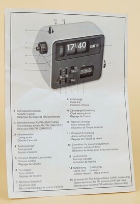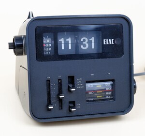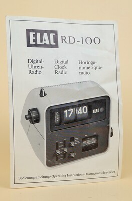 Gebaut von der Firma Electroacustik (ELAC) aus Kiel, zwischen den Jahren 1973 - 1978. Es handelt sich um eine Konbination Radiogerät/Digitaluhr. Das Uhrenradio eignet sich zum Betrieb als normales Rundfunkgerät oder als Wecker. Das Radio schaltet sich zur vorgegebenen Zeit ein und nach -max einer Stunde- automatisch wieder aus. Die Ziffern der Zeitanzeigen (Klappzahlen) sind sehr gut lesbar und lassen sich seitlich, mit dem kleineren der beiden Drehräder, einstellen. Der Betrieb erfolgt ausschließlich über das normale Stromnetz. Mit dem Radioteil lassen sich MW und UKW Sender empfangen. Eine Betriebsanleitung ist im Original erhalten. (siehe Bild)