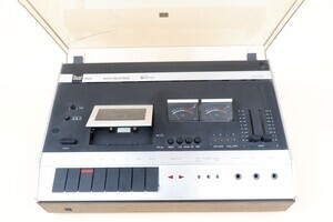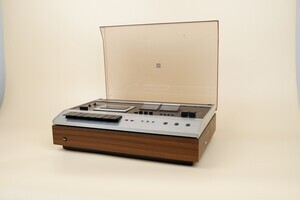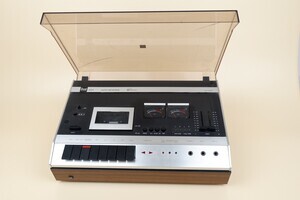 Ein großer, technisch aufwändig konstruierter Kassettenrecorder von Dual aus den Jahren 1973 - 1978. Das Gerät ist bereits mit einer "Autoreversetechnik" ausgestattet. Am Bandende schaltet das Gerät automatisch um und bespielt die nächste Spur. Das manuelle drehen der Kassette entfält damit. Das Gerät ist mit der Stereo Technik ausgestattet, was sich auch an den beiden Aussteuerungsanzeigen für den linken und rechten Kanal erkennen lässt. Für den Betrieb sind ein externer Verstärker und Lautsprecher erforderlich. Der Recorder wir durch eine Plxigla Abdeckhaube geschützt. Der Recorder kann horizontal oder auch stehend betrieben werden.