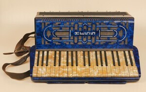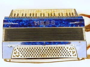 Blaues Akkordeon mit goldenen Tasten (und schwarzen für die Halbtöne). Melodie: Klaviertasten F bis a'' Harmonie: je 20 Knöpfe in 6 Reihen Originale Ledergurte, Originales schwarzes Etui. Das Instrument gehörte Kurz Lorenz aus Koblenz, verst. 1954 (Motorradunfall). Er spielte als Hobbymusiker vor und nach dem 2. Weltkrieg in der Ungebung von Koblenz. Die Fa. Ernst Hess Nachf. /Klingenthal wurde 1872 in Klingenthal gegründet. Die Firma fertigte Handhamonika, Akkordeons und Blechblasinstrumente. Außerdem baute die Firma in den 1920ziger Jahren einen weltweiten Musikversandhandel auf. Das Unternehmen gehörte bis zum 2.Weltkrieg mit zu größten Firmen in Klingenthal. Um 1946/47 gründete der damalige Inhaber in Puchheim bei München eine Fabrik und fertigte dort wieder Akkordeons mit dem Markenname "Hess". Um 1956/57 ist die Firma in Puchheim erloschen.( Vielen Dank an Frau Ulrike Müller vom Harmonikamuseum Zwota für die Infos über die Firma Hess).