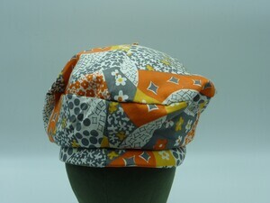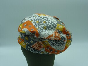 Damenbaskenmütze aus hellem Stoff mit floralen und graphischen Mustern in grau, sonnengelb und orange. Unser Modell ist eine Eigenkreation von Irmgard Hannappel. Hutmacherin mit eigenem Atelier und Geschäft in Trier. Das Geschäft bestand bis zum 9.2.1984. Nach der Auflösung wurden die Bestände dem Museum zur Verfügung gestellt.