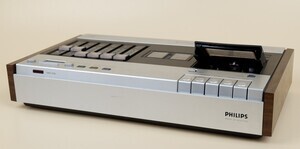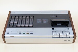 Ein Stereo Kassettenrecorder von Philips aus den Jahren 1973 - 1975. Alle Bedien- und Kontrollinstrumente sind an der Oberseite angeordnet. In der linken Hälfte dominieren 6 Schiebeschalter, mit denen die Lautstärke der beiden Lautsprecher, die Klangfarben und die Aufnahnmepegel, gesteuert werden. Mittig sind die beiden Aussteuerungsanzeigen (Stereo) angeordnet. Das Gerät verfügt über zwei Endstufen je 10 Watt. Externe Lautsprecher sind erforderlich. Ursprünglich im Lieferumfang enthalten, fehlen sie heute bei unserem Gerät. Eingänge sind für Phono, Tonband und Micro vorhanden.