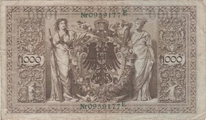 Schein ist zweiseitig in der Druckfarbe grün, braun und schwarz auf beigem Papier gedruckt. Vorderseite: Der Wert als Zahl ist drei Mal gedruckt. Der Wert als Text steht mittig in der zweiten Zeile. Darunter links und rechts das Reichswappen und dazwischen die Unterschriften des Reichsbankdirektoriums. Die Scheinnummer ist links und rechts senkrecht aufgedruckt. Rückseite: Das Mittelbild ziert zwei Frauen, die einen Gebinde Kranz mit preußischem Adler halten und der Kaiserkrone oben als Abschluss. Links und rechts davon in einer Rossette der Wert des Scheins als Zahl. Die Scheinnummer und unter dem Bild, ist je nach Schein, in grün, rot oder schwarz gedruckt
