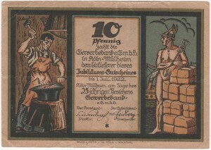 Schein ist beidseitig in den Farben grün, rot und schwarz. Vorderseite: Zwei Bilder am linken und rechten Rand. Links einen Schmied bei der Arbeit am Amboss und rechts Handelsgott an einen Stapel Waren im Hafen angelehnt. Zwischen den Bildern Textfeld. Oben steht der Wert als Zahl und darunter der Text: "zahlt die Gewerbebank G.m.b.H. in Köln Mülheim dem Einlieferer dieses Jubiläums-Gutscheines bis zum 1. Juli 1922. Köln-Mülheim, am Tage des 25 jährigen Bestehens Gewerbebank G.m.b.H" Darunter sind die Unterschriften des Vorstandes gedruckt. Rückseite: In vier Felder aufgeteilt. Oben links eine Schiffer, der eine Fahne mit dem Bild des Heiliger Nepomuk hält. Darunter in Feld der Wert des Scheins als Wort. Oben rechts das Panorama von Köln mit Segel- und Ruderbooten auf dem Rhein. Im Feld darunter der Spruch: "Mülheim, Stadt meiner Kindheit und Jugend. Wie reich thronst du am Ufer des Rheins / Spiegelst dich prächtig in des Stromes Wellen / die mit lautem Gesang grüßen betriebsame Stadt / Dich und im Hafen schunkelnden Schiffen."