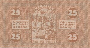 Schein ist beidseitig in den Farben braun und rot. Vorderseite: In einem Rahmen eingefasst, in den die Texte: "Stadt Köln 1921" und "1912" eingedruckt sind, zeigt das Bild auf der rechten Seite die Statue von Jan von Werth. Rechts davon steht "Gutschein über 25 Pfennig und die Scheinnummer. Im linken unter Bereich das Siegel der Stadt Köln in rot und rechts daneben das Herausgabedatum und die Unterschrift des Oberbürgermeisters. Rückseite: Der Wert des Scheins ist als Zahl auf den vier Ecken gedruckt. In der Mitte das Bild eines berittenen Kriegers, vor dem eine Frau sitzt und die Hände aneinander legt. Über dem Bild steht in einer gebogenen Textfahne "Heimkehr" und unter dem Bild "Jan un Griet". Links und rechts vom Bild in Texttafeln "Griet, wer et hätt´ gedoon!" und "Jan, wer hätt´gewoßt!"