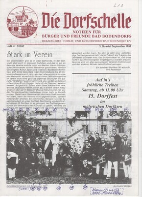 Auf der Titelseite der Dorfschelle 3/1992 ist das Bild des Junggesellenverein von 1927 abgedruckt. Die auf der Seite abgebildeten Junggesellen und Spielleute sind nummeriert und auf einen gesonderten Blatt sind die abgebildeten Personen benannt und einige Informationen zu den Personen hinzugefügt.