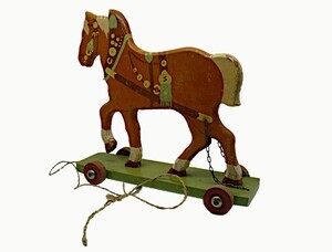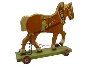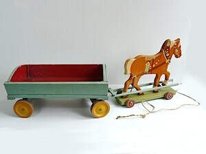 Bemaltes Pferdefuhrwerk zum Nachziehen mit Holzrädchen. Pferd und Anhänger sind mit einer Deichsel verbunden und können mit einer Kordel gezogen werden.