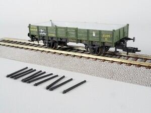 Trix H0 International 23639. Offener Güterwagen mit niedrigen Bordwänden der Königlich Bayerischen Staats-Bahn. Wagenkasten grün mit bunter Beschriftung, Innenraum hellgrau; Fahrgestell schwarz mit bunter Beschriftung. Betriebsnummer 21729 H. Ausgestattet mit Speichenrädern und "Fleischmann-Profi-Kupplung". 10 schwarze Steckrungen lose beiliegend. In originaler Kunststoff-Verpackung.
