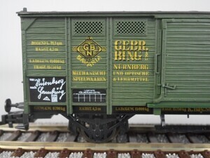 Trix H0 International 52360200 Gedeckter Güterwagen der Königlich Bayerischen Staats-Bahn. Beschriftung der "Bing-Spielwaaren-Fabrik Nürnberg". Wagenkasten grün mit bunter Beschriftung, Dach schwarz; Fahrgestell schwarz mit bunter Beschriftung. Betriebsnummer 86551. Ausgestattet mit Speichenrädern, beweglichen Schiebetüren und "Fleischmann-Profi-Kupplung". In originaler Kunststoff-Verpackung. Nenngröße H0 (Maßstab 1:87), 2-Leiter Gleichstrom-System Bing war eine große Fabrik für Spielzeuge in Nürnberg von 1866 - 1933. Hergestellt wurden Blechspielzeuge, Spielzeug-Dampfmaschinen, Haushaltswaren und Spielzeugeisenbahnen.
