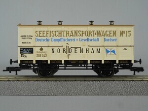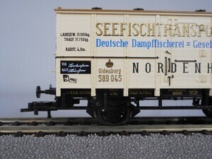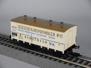 Trix H0 International 52361851 Seefisch-Kühlwagen der "Deutschen Dampfschifferi-Gesellschaft "Nordsee"", eingestellt bei der Großherzoglich Oldenburgischen Eisenbahn. Wagenkasten hellelfenbeinfarbig mit bunter Beschriftung, Dach hellbraun mit 4 aufgesetzten Dachlüftern; Fahrgestell schwarz mit bunter Beschriftung, durchgehende Trittbretter. Betriebsnummer 589045 Oldenburg. Ausgestattet mit Speichenrädern und "Fleischmann-Profi-Kupplung". In originaler Kunststoff-Verpackung. Nenngröße H0 (Maßstab 1:87), 2-Leiter Gleichstrom-System