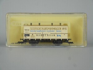 Trix H0 International 52361851 Seefisch-Kühlwagen der "Deutschen Dampfschifferi-Gesellschaft "Nordsee"", eingestellt bei der Großherzoglich Oldenburgischen Eisenbahn. Wagenkasten hellelfenbeinfarbig mit bunter Beschriftung, Dach hellbraun mit 4 aufgesetzten Dachlüftern; Fahrgestell schwarz mit bunter Beschriftung, durchgehende Trittbretter. Betriebsnummer 589045 Oldenburg. Ausgestattet mit Speichenrädern und "Fleischmann-Profi-Kupplung". In originaler Kunststoff-Verpackung. Nenngröße H0 (Maßstab 1:87), 2-Leiter Gleichstrom-System