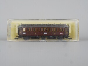 Trix H0 International 52373600 3 achsiger Schnellzugwagen 3. Klasse der Königlich Preußischen Eisenbahn Verwaltung, Baujahr 1897. Faltenbälge an den Stirnseiten zum geschützten Übergang in den nächsten Wagen "Durchgangswagen"; "D-Zug". Wagenkasten braun mit bunter Beschriftung, Dach grausilber mit Oberlichtaufbau; Fahrgestell schwarz mit bunter Beschriftung und 2 Gasbehältern. Betriebsnummer "951". Ausgestattet mit Speichenrädern (mittlerer Radsatz in seitenverschiebbarer Aufnahme). Beidseitig montierte "Fleischmann Profi-Kupplung". In originaler Kunststoff-Verpackung. Nenngröße H0 (Maßstab 1:87), 2-Leiter Gleichstrom-System Epoche 1 (Länderbahn-Zeit 1835 - 1920)