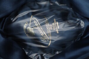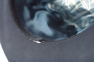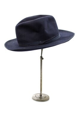 Dieser dunkelblaue Haarfilzhut stammt aus der italienischen Hutmanufaktur Borsalino. Der Filz ist zu einem feinen Velours verarbeitet. Der Übergang zwischen Krone und Krempe bildet ein schmales dunkelblaues Ripsband mit einer Schlaufe an der linken Seite sowie ein dunkelblaues Gummikordel. Mit diesem Ripsband ist auch die Krempe eingefasst. Es befinden sich zwei Pappschilder auf dem Hut, die unter das Hutband geklemmt sind. Auf dem Etikett, welches an der rechten Seite angebracht ist steht 'GLADEN BORSALINO' handschriftlich und in schwarzen Majuskeln geschrieben und das frontal angebrachte Schild trägt ebenfalls den Namen der Manufaktur 'BORSALINO', welches ebenfalls handschriftlich und in Majuskeln mit einem roten Stift geschrieben wurde. Darunter wurde groß der Preis von '198.50' genannt, hier wieder in schwarzer Handschrift. Gefüttert ist der Hut in einem mittelblauen, schweren Satin. Das Schweißband fehlt, ebenso wie ein Übergang zwischen Krempe und Futter. Das Futter ist unterschiedlich kurz, als wäre es unsauber herausgeschnitten worden. Es beginnt sich an den Seiten zu lösen. Ein weiteres Indiz für ein abgetrenntes Futter (ferner auch für das potentiell vorhandene Schweißband) bildet das unsaubere Nahtbild an dieser Stelle mit herausschauenden Fäden. Das Futterdach ist intakt und zeigt unter der durchsichtigen Folie in Gold auf den mittelblauen Satin gedruckt das Firmenlogo 'BORSALINO' sowie eine Krone und die weiteren Titel 'QUALITA' SUPERIORE', 'ALESSANDRIA', '1857', 'ITALIA', 'MARCA DE POSITATE' und 'MADE IN ITALY'. Der Allgemeinzustand des Hutes ist schlecht. Die Krempe, wie auch die Krone sind aus der Form gekommen, das Futter wie beschrieben kaputt und an der rechten Vorderseite ein 3cm großes Loch mit glatten Kanten, was auf einen Schnitt hinweist.
