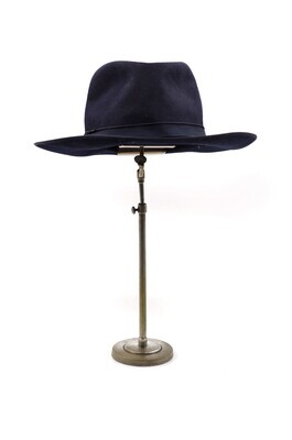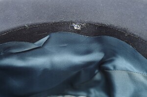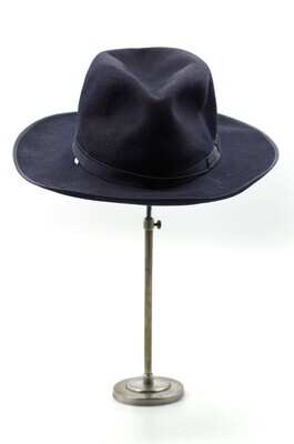 Dieser dunkelblaue Haarfilzhut stammt aus der italienischen Hutmanufaktur Borsalino. Der Filz ist zu einem feinen Velours verarbeitet. Der Übergang zwischen Krone und Krempe bildet ein schmales dunkelblaues Ripsband mit einer Schlaufe an der linken Seite sowie ein dunkelblaues Gummikordel. Mit diesem Ripsband ist auch die Krempe eingefasst. Es befinden sich zwei Pappschilder auf dem Hut, die unter das Hutband geklemmt sind. Auf dem Etikett, welches an der rechten Seite angebracht ist steht 'GLADEN BORSALINO' handschriftlich und in schwarzen Majuskeln geschrieben und das frontal angebrachte Schild trägt ebenfalls den Namen der Manufaktur 'BORSALINO', welches ebenfalls handschriftlich und in Majuskeln mit einem roten Stift geschrieben wurde. Darunter wurde groß der Preis von '198.50' genannt, hier wieder in schwarzer Handschrift. Gefüttert ist der Hut in einem mittelblauen, schweren Satin. Das Schweißband fehlt, ebenso wie ein Übergang zwischen Krempe und Futter. Das Futter ist unterschiedlich kurz, als wäre es unsauber herausgeschnitten worden. Es beginnt sich an den Seiten zu lösen. Ein weiteres Indiz für ein abgetrenntes Futter (ferner auch für das potentiell vorhandene Schweißband) bildet das unsaubere Nahtbild an dieser Stelle mit herausschauenden Fäden. Das Futterdach ist intakt und zeigt unter der durchsichtigen Folie in Gold auf den mittelblauen Satin gedruckt das Firmenlogo 'BORSALINO' sowie eine Krone und die weiteren Titel 'QUALITA' SUPERIORE', 'ALESSANDRIA', '1857', 'ITALIA', 'MARCA DE POSITATE' und 'MADE IN ITALY'. Der Allgemeinzustand des Hutes ist schlecht. Die Krempe, wie auch die Krone sind aus der Form gekommen, das Futter wie beschrieben kaputt und an der rechten Vorderseite ein 3cm großes Loch mit glatten Kanten, was auf einen Schnitt hinweist.