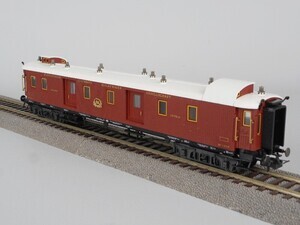 Trix H0 International 52379200 4-achsiger Gepäckwagen der C.I.W.L (Compagnie Internationale des Wagons-Lits). Baujahr 1908. Faltenbälge an den Stirnseiten zum geschützten Übergang in den nächsten Wagen "Durchgangswagen"; "D-Zug". Wagenkasten rot mit bunter Beschriftung, 4 bewegliche Schiebetüren, Dach weißgrau mit 2 Zugführer-Dachkanzeln und mehreren Lüftern ; Fahrgestell schwarz mit bunter Beschriftung. Betriebsnummer "1205". Ausgestattet mit Innenbeleuchtung. In originaler Kunststoff-Verpackung. Beiliegend Bogen mit selbsklebenden Zuglaufschildern. Nenngröße H0 (Maßstab 1:87), 2-Leiter Gleichstrom-System Epoche 1 (Länderbahn-Zeit 1835 - 1920)