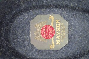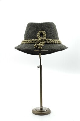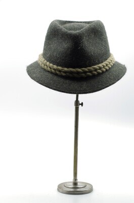 Ein Haarfilzhut der Firma Mayser in Rauhaartechnik. Er ist graubraun meliert mit Nuancen ins Grünliche. Die Haare sind nur lose gefilzt worden, sodass die einzelnen Haare noch erkennbar sind und leicht herausgezogen werden könnten, was ihn grob aber auch kernig erscheinen lässt und ihm einen bodenständigen, traditionellen Charakter verleiht. Es handelt sich um dicke, grobe Haare. In Form und Materialität verweist der Hut auf süddeutsche Tradition und Tracht, wozu auch das grobe, gedrehte grünbraune Hutkordel passt, welches zweimal um die Hutkrone verläuft und hinten mit einem Schmuckknoten verschlossen ist. Die Krone selbst hat vorne zwei Kniffe und das Kronendach ist oval vertieft. Die Krempe ist umlaufend leicht nach unten gebogen. Der Hut ist nicht gefüttert. Im Inneren befindet sich ein forstgrünes, breites Schweißband, welches hinten, am Über- und Untertritt, mit einem roten, kreisrunden Logoetikett siegelartig verschlossen ist. Im Dach des Hutes ist ebenfalls das Mayser Logo angebracht. Auf einem grünbraunem Stoffachteck ist in Gold und Rot das Emblem gestickt mit dem Verweis darauf, dass es sich bei diesem Hut um ein handwerklich gefertigtes Naturprodukt handelt. Dieser Hut ist dreimal vorhanden, zweimal in Hutgröße 56 und einmal in Größe 57. Maße für Hutgröße 57.