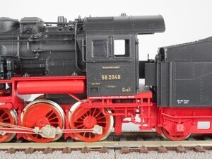 Fleischmann H0 4156 Güterzug-Dampflok Baureihe 56 der Deutschen Reichsbahn-Gesellschaft. Betriebs-Nr. 56 2048 Schlepptender-Dampflok mit 4 Kuppelachsen, 1 Vorlaufachse und 3-achsigem Tender. Kessel, Führerhaus und Tenderaufbau schwarz, Räder und Fahrgestell rot. Beschriftung gold und weiß. Antrieb im Tender, 2 Achsen angetrieben. Gehäuse aus Kunststoff. Je 2 beleuchtete Stirnlampen an Lok und Tender. Radkränze und Gestänge vernickeltes Metall. Am Tender "Roco Kurzkupplung". Original-Verpackung aus Karton mit Kunststoff-Einsatz. Beiligend Anleitung. 2-Leiter Gleichstrom-System analog. Epoche 2 (Staatsbahn-Zeit 1920-1945)