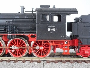 Trix H0 International 2409 Güterzug-Dampflok Baureihe 38 der Deutschen Reichsbahn-Gesellschaft. Bayerische Bauart (P 3/5 H). Betriebs-Nr. 38 403 Schlepptender-Dampflok mit 3 Kuppelachsen, 2 Vorlaufachsen und 4-achsigem Tender. Kessel, Führerhaus und Tenderaufbau schwarz, Räder und Fahrgestell rot. Beschriftung gold und weiß. Antrieb im Tender, 3 Achsen angetrieben. Gehäuse aus Kunststoff. Je 2 beleuchtete Stirnlampen an Lok und Tender. Radkränze und Gestänge vernickeltes Metall. Am Tender Standard-Kupplung. Original-Verpackung aus Karton mit Kunststoff-Einsatz. Beiligend Anleitung. 2-Leiter Gleichstrom-System analog. Epoche 2 (Staatsbahn-Zeit 1920-1945)