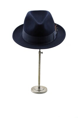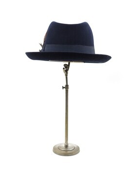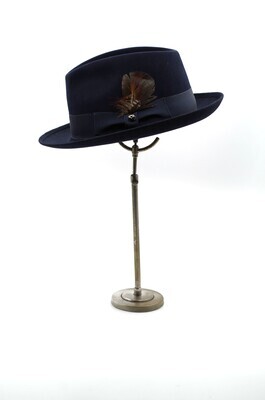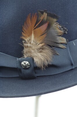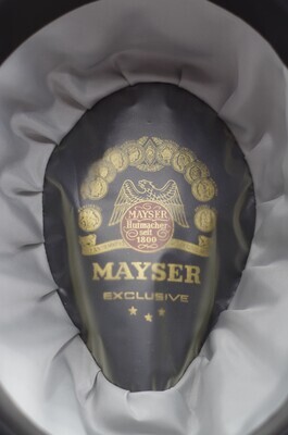 Ein Herrenhut der Firma Mayser, der Linie 'Exclusive'. Es handelt sich um ein Trilby aus dunkelblauem Velours. Die typischen Merkmale der Trilbyform wie die nach oben gerollte Krempe, die seitlichen Kniff in der Krone und das leicht und nach hinten breiter werdende eingedrückte Kronendach sind charakteristisch. Umbunden ist die Krone mit einem 4cm breiten, dunkelblauen Ripsband, welches an der linken Seite gekniffen und zu einer Schleife drapiert ist. Diese wird von einer Federgarnitur aus drei Federn geschmückt. Zusätzlich ist auf der Schlaufe ein nickelfarbener Mayseraufnäher mit einem großen 'M' angebracht. Das Hutband ist mit langen Laufstichen an der Oberseite geheftet. Die Krempenkante ist 0,5cm nach oben umgeschlagen und festgesteppt. Im Inneren findet sich ein schwarzes Schweißband aus Leder, auf das in goldenen Lettern auf der linken Seite 'MAYSER' und auf der rechten Seite 'W. GEORG TRIER' gedruckt ist. An der Überlappungskante des Schweißbandes findet sich der siegelartige, rote Mayserpunkt. Das Futter besteht aus silberblauem Satin und ist zum Dach hin gleichmäßig eingekniffen. Das Futterdach ist im Kontrast mit dunkelblauem Satin gefüttert und foliert. Auf dem Futterdach ist das Mayserlogo in Gold und Rot gedruckt, und darunter der Zusatz 'Exclusice ***' zu finden. Der Hut ist in vier Ausführungen erhalten. Einmal in der Größe 57, zweimal in 58 und einmal in 59.