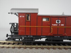 Roco 4209 2-achsiger Gepäckwagen der Königlich Preußischen Eisenbahn Verwaltung (K.P.E.V.). Aufbau mit einseitiger Bühne, erhöhte Zugführerkanzel und 2 Schiebetüren. Durchgehende Trittbretter längsseitig. Betriebsnummer Frankfurt P 4380 Wagenkasten rotbraun mit weißer Beschriftung und gelben Linien (Griffstangen), Dach grausilber, Fahrgestell schwarz mit weißer Beschriftung. Speichenräder. Kurzkupplungs-Kinematik. Beidseitig "Fleischmann Profi-Kupplung" (Kurzkupplung) Baugröße H0 (Maßstab 1:87) 2-Leiter Gleichstrom System Epoche 1 (Länderbahn-Zeit 1835 - 1920)