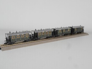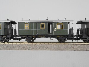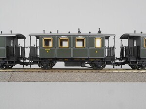Roco 44014 4 Modelle 2-achsiger Lokalbahn-Personenwagen der Königlich Bayerischen Staats-Bahn. Personenwagen 3. Klasse CL 20669 Personenwagen 3. Klasse Cl 20688 Gepäckwagen GwL 18752 Post-Wagen PPostL 21062 Kurze Lokalbahn-Wagen mit Bühnen (Postwagen nur einseitig Bühne) und flachem Dach. Wagenkasten dunkelgrün mit bunter Beschriftung und schwarz-weißer Linierung, Dach grausilber, Fahrgestell schwarz mit gelber Beschriftung. Speichenräder. Post- und Gepäckwagen mit beweglichen Schiebetüren. Kurzkupplungs-Kinematik. Beidseitig "Fleischmann Profi-Kupplung" (Kurzkupplung) Baugröße H0 (Maßstab 1:87) 2-Leiter Gleichstrom System Epoche 1 (Länderbahn-Zeit 1835 - 1920)