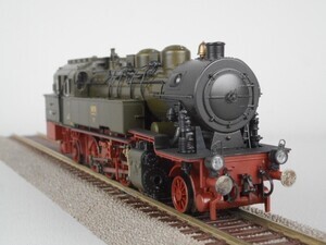 Roco H0 63260 Tender-Dampflok Gattung T 14 der Königlich Preußischen Eisenbahn Verwaltung. Betriebs-Nr. "8976 Berlin" Sonderserie 2002 Heißdampf-Tender-Dampflok für Güter- und Personenzugdienst mit 4 Kuppelachsen, 1 Vorlauf-Achse und 1 Nachlauf-Achse (1´D1´ h2). Spätere Baureihe 93, gebaut ab 1916. Kessel, Führerhaus und Wasserkästen dunkelgrün mit goldener, gelber und weißer Beschriftung, Rauchkammer schwarz, Räder und Fahrgestell rotbraun. Antrieb im Kessel, 4 Achsen angetrieben. Gehäuse der Lok aus Kunststoff. Je 2 beleuchtete Stirnlampen beidseitig. Radkränze und Gestänge brüniertes Metall. Am Tender "Fleischmann-Profi-Kupplung" (Kurzkupplung). Original-Verpackung aus Karton mit Kunststoff-Einsatz. Beiligend Anleitung. 2-Leiter Gleichstrom-System analog. Epoche 1 (Länderbahn-Zeit 1835 - 1920)