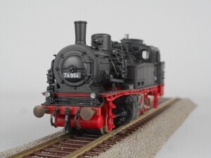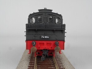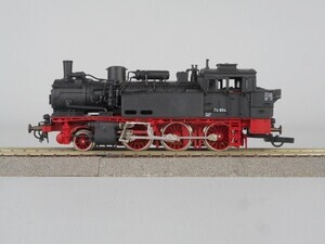 Roco H0 43271 Heißdampf-Tender-Dampflok Baureihe 74 der Deutschen Reichsbahn-Gesellschaft. Preußische Bauart (T 12), ab 1903. Betriebs-Nr. 74 904 Tender-Dampflok mit 3 Kuppelachsen und 1 Vorlaufachse (Bauart 1´C h2). Kessel, Führerhaus und Tenderaufbau schwarz, Räder und Fahrgestell rot. Beschriftung weiß. Antrieb im Führerhaus, 3 Achsen angetrieben. Gehäuse aus Kunststoff. Je 2 beleuchtete Stirnlampen beidseitig. Radkränze und Gestänge vernickeltes Metall. An Rückseite "Roco Kurzkupplung". Original-Verpackung aus Karton mit Kunststoff-Einsatz. Beiligend Anleitung und diverse Zurüstteile. 2-Leiter Gleichstrom-System analog. Epoche 3 (frühe Bundesbahn-Zeit 1945 - 1969)