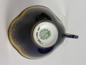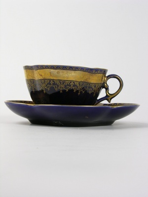 Vierpaßförmige Tasse und zughörige Untertasse mit tiefblauer Glasur und vergoldetem, neobarockem Dekor mit umlaufendem Band und Arabesken. Durch die Porzellanmarke (aufgestempeltes grünes Sarreguemines-Wappen) auf der Unterseite des Tassenfußes können Tasse und Untertasse der Fayencemanufaktur in Saargemünd zugeordnet werden, wo sie wohl in der zweiten Hälfte des 19. Jh. hergestellt wurden (die grünen Wappenstempel wurden dort um 1850 eingeführt). Die Manufaktur wird 1790 durch Nicolas-Henri Jacobi unter den schwierigen Umständen der Revolutionszeit gegründet und 1799 von dem aus Bayern stammenden Paul Utzschneider (1771-1844) übernommen. Es entwickelt sich ein erfolgreiches Unternehmen, zu dessen Stammkunden auch Napoleon Bonaparte zählt. 1836 übergibt Utzschneider die Leitung an seinen Schwiegersohn Alexander von Geiger (1808-1891). Nach dem Anschluss ans Deutsche Reich 1871 übernimmt der Sohn Paul von Geiger den Betrieb. Es entstehen zwei weitere Manufakturen in Digoin und Vitry-le-François, zeitweilig sind mehr als 3.000 Personen in den Betrieben beschäftigt. Im Zweiten Weltkrieg kommt das Unternehmen unter Zwangsverwaltung und wird von Villeroy&Boch geführt. Ab 1978 leitet ein französisches Konsortium das Unternehmen bis es 2007 liquidiert wird. [Johanna Kätzel]