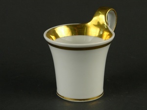Die Tasse stammt aus der Porzellanmanufaktur "Fürstenberg". Eine zylindrische weiße Tasse, mit Campanerhenkel. Am Rücken ist sie vergoldet. Innen am Rand der Tasse ist ein breiter Goldstreifen, außen ist ein schmaler Goldstrich an der Lippe und am Fuß. Die Untertasse ist weiß mit breitem Goldstreifen außen und innen am Rand und am schmalem Kreis um den Spiegel. Beide Stücke mit blauem Fürstenberg (heutiges) Zeichen. Golddruck A 37 21