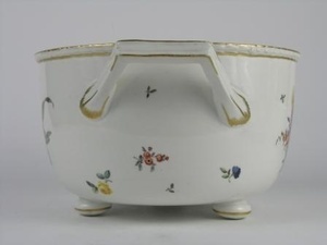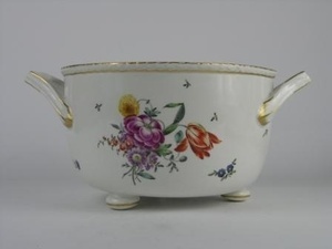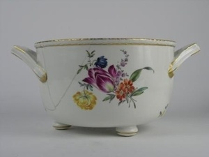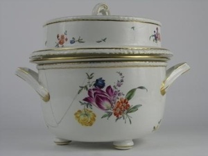 Breite runde Schüssel mit zwei trapezförmigen Henkeln auf drei kurzen runden Füßen. Reliefiertes Knospenmuster eingerahmt von Goldrand an jeder Seite am oberen Rand der Schüssel. Der bunte Blumendekor besteht aus einem Hauptmotiv aus Tulpen und Anemonen sowie Streublumen. An der Schüssel ist die Blaumarke CT angebracht und die Zahl 78, die eine Datierung auf 1778 ermöglicht. Teil dieses Sets ist eine flachere Schüssel mit geradem Rand. Diese wird in die breitere Schüssel eingesetzt. Ihr Rand ist mit bunten Streublumen und Goldrand verziert. die flachere Schüssel hat keine Marke, eingeritzt ist HIIO. Ein weiterer Teil ist der Deckel mit Metallreif am Innenrand. Verziert ist er mit einem flachreliefierten Knospenmuster am äußeren Rand. Verziert ist er mit buntfarbigen Streublumen, in der Mitte ist ein Schlaufenhenkel mit Goldverzierung und Goldstreifen zieren alle Außenränder. Dazu gehört eine flache Schüssel mit geradem Rand als Schüsseleinsatz. Auf dem Rand sind bunte Streublumen und Golddekor. Keine Marke, eingeritzt HIIO.