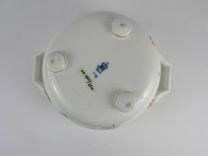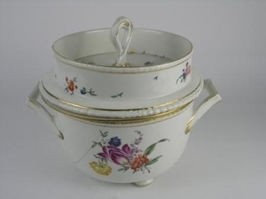 Breite runde Schüssel mit zwei trapezförmigen Henkeln auf drei kurzen runden Füßen. Reliefiertes Knospenmuster eingerahmt von Goldrand an jeder Seite am oberen Rand der Schüssel. Der bunte Blumendekor besteht aus einem Hauptmotiv aus Tulpen und Anemonen sowie Streublumen. An der Schüssel ist die Blaumarke CT angebracht und die Zahl 78, die eine Datierung auf 1778 ermöglicht. Teil dieses Sets ist eine flachere Schüssel mit geradem Rand. Diese wird in die breitere Schüssel eingesetzt. Ihr Rand ist mit bunten Streublumen und Goldrand verziert. die flachere Schüssel hat keine Marke, eingeritzt ist HIIO. Ein weiterer Teil ist der Deckel mit Metallreif am Innenrand. Verziert ist er mit einem flachreliefierten Knospenmuster am äußeren Rand. Verziert ist er mit buntfarbigen Streublumen, in der Mitte ist ein Schlaufenhenkel mit Goldverzierung und Goldstreifen zieren alle Außenränder. Dazu gehört eine flache Schüssel mit geradem Rand als Schüsseleinsatz. Auf dem Rand sind bunte Streublumen und Golddekor. Keine Marke, eingeritzt HIIO.
