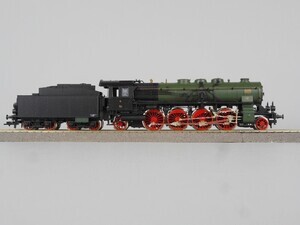 Fleischmann H0 4885 Zugpackung: "D-Zug der Preußischen Staatsbahnen" Sonderserie 1988 Der Zug stellt einen kurzen D-Zug (Schnellzug) anfang der 1920er Jahre dar. Es ist die Übergangszeit von den Länderbahnen auf die Deutsche Reichsbahn Gesellschaft ab 1920. Lokomotive und Wagen tragen noch den Anstrich der vorigen Bahngesellschaft. Personenzug-Dampflok Gattung P 10 der Preußischen Eisenbahn Verwaltung. Betriebs-Nr. 2810 Elberfeld Schlepptender-Dampflok mit 2 Kuppelachsen, 1 Vorlauf- sowie 1 Nachlauf-Achse und 4-achsigem Tender. Kessel grün mit goldener, gelber und weißer Beschriftung, Stehkessel, Führerhaus und Tender schwarz, Räder und Fahrgestell rot. Antrieb im Tender, 2 Achsen angetrieben. Gehäuse der Lok und des Tenders aus Kunststoff. Je 2 beleuchtete Stirnlampen an Lok und Tender. Radkränze und Gestänge vernickeltes Metall. Am Tender Kurzkupplungs-Kinematik und "Fleischmann Profi-Kupplung" (Kurzkupplung). 4 Stück 4-Achsige Schnellzug-Wagen mit Faltenbälgen ("Durchgangswagen"): Gepäckwagen "Halle P 01141" mit 4 Schiebetüren und Zugführerkanzel im Dach. Farbe Rotbraun mit weißer Beschriftung. Speisewagen "No. 0792" Mittelbrauner Holzaufbau mit Oberlichtaufbau auf dem Dach. Inneneinrichtung mit weißen Tischen. Dach graubraun. Personenwagen 1./2./3. Klasse "02728" Braun/dunkelgrüner Wagenkasten mit bunter Beschriftung und Zierlinien; Dach mit Oberlichtaufbau graubraun. Personenwagen 3. Klasse "03088" Wagenkasten braun mit bunter Beschriftung und Zierlinien, Dach mit Oberlichtaufbau graubraun. Original-Verpackung aus Karton mit Kunststoff-Einsatz. 2-Leiter Gleichstrom-System analog. Epoche 1 (Länderbahn-Zeit 1835 - 1920)