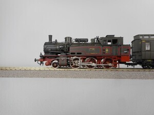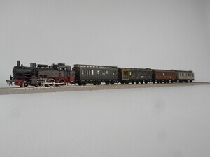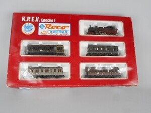 Zugpackung: Personen-Zug der Königlich Preußischen Eisenbahn Verwaltung Sonderserie 1985 zum 25-jährigen Firmen-Jubiläum von Roco. Der Zug stellt einen Personen-Zug um 1910 dar. Tenderlok T12 mit 3 3-achsigen Abteilwagen und Postwagen. Tender-Dampflok Gattung T 12 der Preußischen Eisenbahn Verwaltung. Betriebs-Nr. "7726 Erfurt" Dampflok mit 3 Kuppelachsen, 1 Vorlaufachse. Kessel, Wasserkästen und Führerhaus grün mit bunter Beschriftung, Rauchkammer schwarz, Räder und Fahrgestell rotbraun. Antrieb im Führerhaus, 3 Achsen angetrieben. Gehäuse der Lok aus Kunststoff. Beidseitig beleuchtete Stirnlampen. Radkränze und Gestänge vernickeltes Metall. Am Tender Kurzkupplungs-Kinematik und "Fleischmann Profi-Kupplung" (Kurzkupplung). Alle Wagen haben durchgehenden Oberlicht-Dachaufbau in graubraun, Speichenräder und durchgehende Trittbretter längsseits. Postwagen "2847" Wagenkasten dunkelgrün mit bunter Beschriftung. Personenwagen 1./2. Klasse "397" dunkelgrüner Wagenkasten mit bunter Beschriftung und gelben Zierlinien um das 1. Klasse-Abteil. Personenwagen 3. Klasse "886" Wagenkasten braun mit bunter Beschriftung. Personenwagen 4. Klasse "1258" Wagenkasten grau mit bunter Beschriftung. Original-Verpackung aus Karton mit Kunststoff-Einsatz. Zurüstteile (Lüfter, Griffstangen) liegen bei. 2-Leiter Gleichstrom-System analog. Epoche 1 (Länderbahn-Zeit 1835 - 1920)