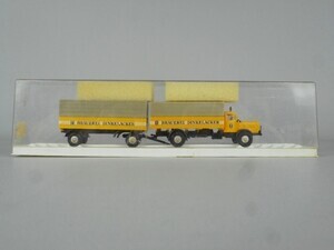 Modell-LKW mit Anhänger der "Dinkelacker Brauerei". Aufbau gelb mit hellgrüner Plane, Fahrgestell schwarz. Maßstab 1:87 als Zubehör zu H0 Modell-Eisenbahnen.