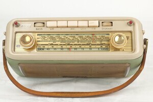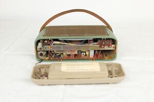 Hergestellt in den Jahren 1961/1962 von Schaub Lorenz in Pforzheim. Rundum ist das Kofferradio mit grünem Leder bezogen. Lediglich der Bereich des Lautsprechers ist ausgespart und mit Stoff verkleidet. Über 5 Drucktasten lassen sich alle Wellenbereich auswählen. Die beiden Drehschalter dienen zur Senderwahl bzw. der Lautstärkeneinstellung. Um an das Batteriefach zu gelangen muss die Bodenplatte abgeschraubt werden. Der eigentliche Batteriebereich ist dann nochmals abgedeckt. Es sind 5 x 1,5 V Zellen zum Betrieb notwendig oder ein Anschluss an ein externes Netzteil. Ein Anschluss an eine Autobatterie ist ebenfalls möglich. Ob 6 oder 12 Volt muss am Gerät voreingestellt werden. Mit gut 300 DM im Verkauf war das Gerät damals recht teuer. "
