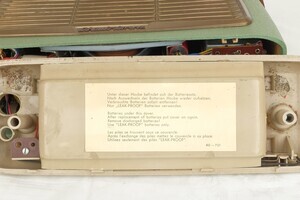 Hergestellt in den Jahren 1961/1962 von Schaub Lorenz in Pforzheim. Rundum ist das Kofferradio mit grünem Leder bezogen. Lediglich der Bereich des Lautsprechers ist ausgespart und mit Stoff verkleidet. Über 5 Drucktasten lassen sich alle Wellenbereich auswählen. Die beiden Drehschalter dienen zur Senderwahl bzw. der Lautstärkeneinstellung. Um an das Batteriefach zu gelangen muss die Bodenplatte abgeschraubt werden. Der eigentliche Batteriebereich ist dann nochmals abgedeckt. Es sind 5 x 1,5 V Zellen zum Betrieb notwendig oder ein Anschluss an ein externes Netzteil. Ein Anschluss an eine Autobatterie ist ebenfalls möglich. Ob 6 oder 12 Volt muss am Gerät voreingestellt werden. Mit gut 300 DM im Verkauf war das Gerät damals recht teuer. "