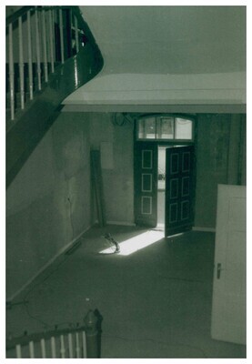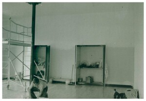 Schwarzweißfotografie. Diese Aufnahme zeigt einen Blick in einen Innenraum der im Jahr 1847/48 erbauten ehemaligen katholischen Knabenschule auf dem Kirchplatz in Bendorf, während der Renovierungsarbeiten in den 1980er Jahren. Das Bruchsteingebäude mit abgetrepptem Giebel war 1848 als katholisches Schulhaus nach Entwürfen von Ferdinand Jakob Nebel errichtet worden. Von den 1980er Jahren bis zum Jahr 2000 war das damalige Stadtmuseum Bendorf, Museum für Sozial- und Industriegeschichte, hier untergebracht. Das Museum (heute Rheinisches Eisenkunstguss-Museum) ist im Mai 2000 im Schloss Sayn eröffnet worden und wird im Jahr 2019 ein weiteres Mal auf das Gelände der Sayner Hütte umziehen. Heute beherbergt das Gebäude am Kirchplatz 9 b die ökumenische Bibliothek und die VHS Bendorf.