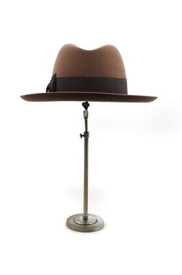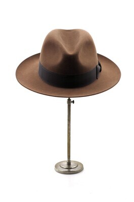 Bei dem Herrenhut aus dem Hause Mayser handelt es sich um einen mokkafarbenen Fedora aus Velours. Der durchlaufende Längseinschlag im Kronendach und die markanten Kniffe in der Hutkrone typisieren ihn und die größere Krempe unterscheidet ihn in seiner Form vom Trilby. Die Krempe ist offen verarbeitet und leicht nach oben gebogen. Auch das Hutband, welches als 4cm breites Ripsband daherkommt und an der linken Seite gekniffen und mit einer Schlaufe zur Schleife geformt ist, sind charakteristisch für den Fedora. Das Hutband ist an der Oberseite mit langen Laufstichen festgeheftet. Im Inneren findet sich ein perforiertes, dunkelbraunes Lederschweißband, auf das in goldenen Lettern der Produzent 'MAYSER' und der Verkäufer, also der Hutladen 'W. GEORG TRIER' gedruckt sind. Das Hutfutter ist ein beiger Satin, der zum Futterdach hin gleichmäßig gekniffen ist. Das Futterdach selbst ist ebenfalls mit dem beigen Satin gefüttert und foliert. Auf ihm ist das Logo der Firma Mayser in Gold und Rot aufgedruckt. Darunter befindet sich ebenfalls in Gold der verschnörkelte und handschriftlich anmutende Zusatz 'Super'. Das Modell ist in fünf Ausführungen vorhanden. Je einmal in den Größen 55, 56, 59 und zweimal in der Größe 57. Auf dem Preisschild wird ein Preis von 170 ,- aufgerufen. Die Maßangaben beziehen sich auf Hutgröße 57. Der Zustand ist gut. Lediglich die Folie am Futterdach ist leicht vergilbt.