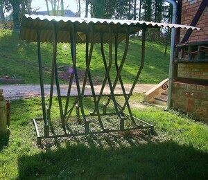 Fahrradständer vom Bahnhof Bad Breisig. Abgebaut 2017, war zu diesem Zeitpunkt nicht mehr in Gebrauch und von Dornensträuchern überwachsen. Ein "Klassischer" Fahrradständer der früher an praktisch jedem Bahnhof zu finden war. In Konz stand ein Fahrradständer dieses Typs bis etwa 2018 am Haupbahnhof. Leider ist er ungeeignet für Fahrräder mit breiten Reifen wie z.B. Mountainbikes. Dabei hat dieser Ständer gengenüber den meisten neueren Kollegen den Vorteil den ein Dach zu haben und so das Fahrrad vor Nässe zu schützen.