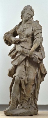 In der Trierer Werkstatt des Bildhauers Johannes Neudecker wurde um 1725 ein umfangreicher Figurenzyklus für eine repräsentative Gartenanlage geschaffen, darunter auch eine Statue der Kleopatra. Auftraggeber der Bildwerke war vielleicht Kurfürst Franz Ludwig von Pfalz-Neuburg. Die Figur führt in moderat dynamischer Bewegung die tödliche Schlange an ihre Brust. Dabei bleibt die Haltung weitgehend in der Bildebene, auf eine Hauptansicht fixiert. Charakteristisch für Neudeckers Gestaltungsweise sind auch der kleine, bewegt zur Seite geneigte Kopf mit hoher Stirn und der wehmütig leidende Gesichtsausdruck. Das Gewand der Figur bildet brüchige, häufig bandförmige Falten. Eine breite Stoffbahn, die sich rückseitig mit der amorphen Standfläche verbindet, dient der statischen Stabilisierung.