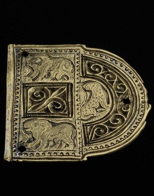 Der viereckige Gürtelbeschlag mit halbrundem Abschluss zeigt um ein kerbschnittverziertes, quadratisches Feld zwei rechteckige und ein halbrundes Feld mit gepunzter und eingravierter figürlicher Verzierung. Man sieht einen Tiger, einen sitzenden Leoparden (oder Panther), der seinen Kopf rückwärts gewendet hat und einen Löwen mit leicht gedrehtem Kopf. Leider ist an der gerundeten Abschlusskante der charakteristische Fortsatz in Form eines Adlerkopfpaares abgebrochen und verloren. Derartige kerbschnittverzierte Beschläge zählen zu den wichtigsten Bestandteilen spätrömischer Männergürtel. Das Objekt wurde im Arenekeller des Trierer Amphitheaters gefunden.