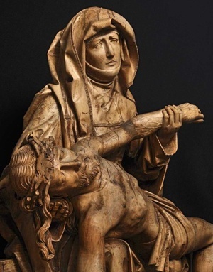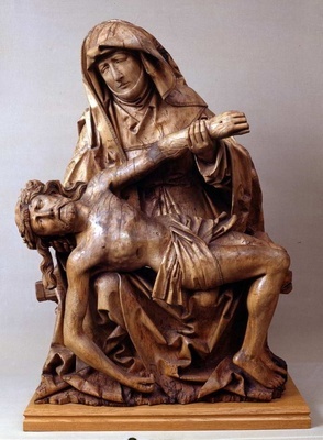 Das Schnitzbild der Gottesmutter mit dem toten Jesus stand ursprünglich in der Pfarrkirche von Babenhausen in Hessen. Formensprache und Qualität des Werkes weisen auf Tilman Riemenschneider, einen der führenden Meister der spätgotischen Skulptur im deutschen Sprachraum. Vermutlich stammt die Gruppe aus der Würzburger Werkstatt dieses berühmten Bildhauers. Die Intensität des Ausdrucks von Schmerz und Trauer zeichnet die Gruppe in besonderer Weise aus. Mit dem demonstrativ in die Bildebene gedrehten Oberkörper des Leichnams Christi wird die Anteilnahme des Betrachters geradezu herausgefordert. Dieses Motiv steht in einer Bildtradition, die in der altniederländischen Malerei bei Rogier van der Weydens Kreuzabnahme (Prado, Madrid) vermutlich ihre Wurzeln hat.