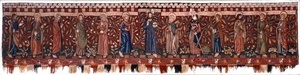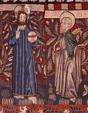 In einer dreiteiligen Komposition sind Christus und die zwölf Apostel auf einem spätgotischen Bildteppich dargestellt. Das gestalterisch betonte Mittelstück ist Christus vorbehalten, der größer wiedergegeben ist als die zu beiden Seiten stehenden Jünger. Segnend, mit der Erdkugel in der Linken, tritt er als "Salvator mundi" - Retter der Welt auf. Die Apostel tragen ihre üblichen individuellen Attribute und sind ebenfalls mit einem Schriftband über ihren Köpfen versehen, in welchen ihre Namen stehen. Aufgrund der Pflanzensymbolik kann das Bild als Darstellung der Osterbotschaft verstanden werden. Dafür sprechen sowohl die fruchttragenden Zweige von Eiche und Kirsche oder Lorbeer im Bildhintergrund, als auch die den Jüngern zugewiesenen Frühlingsblumen am Boden, die allesamt auf die Erneuerung des Lebens verweisen.