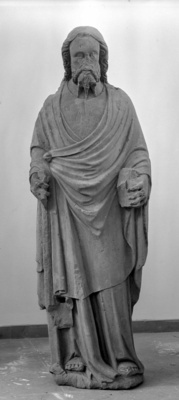 Diese lebensgroßen Bildwerke von zwei Aposteln haben trotz erheblicher Beschädigungen durch Abstoßungen und Kritzeleien kaum etwas von ihrem imposanten Erscheinungsbild eingebüßt. Stil und Haltung der Figuren entsprechen einander, trotz alledem konnte die Werkstatt der ausführenden Bildhauer noch nicht ermittelt werden. Unterschiede äußern sich lediglich in Proportion, Frisur und Barttracht, allerdings sind die charakteristischen Attribute für eine namentliche Bestimmung der Apostel nicht erhalten. Im Jahr 1687 wird für den Chor der gotischen Karmeliterkirche in Trier eine figürliche Apostelreihe urkundlich erwähnt. Dieser Hinweis wird durch wandfeste Konsolen und Baldachine bestätigt, die 1904 beim Abbruch der Reste des Kirchenchores geborgen wurden. Im selben Jahr erwarb das Museum die beiden Statuen aus Privatbesitz, die wohl aus diesem Figurenzyklus stammen.