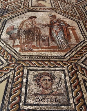 Auf dem bekanntesten römischen Musenmosaik in Trier unterweist die Muse EVTERP(E) den interessiert dreinblickenden Musiker (HY)AGNIS im Gebrauch der Doppelflöte. Das Bild ist das am besten erhaltene von neun Achteckfeldern, auf denen die Musen einen Weisen in ihrer Kunst unterrichten. Im achteckigen Mittelfeld des in weiten Teilen zerstörten Schmuckfußbodens ist die Signatur des Künstlers noch erhalten: Monnus Das Musenmosaik des Monnus weist vielfältige Bezüge zu den Künsten und der Bildungswelt der Antike auf. Es wurde beim Bau des Trierer Landesmuseums 1884 in den Ruinen eines zum kaiserlichen Palastbezirk gehörigen Hauses entdeckt.