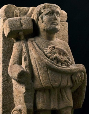 In der mit Schlegel, Traube und Fässern dargestellten Gottheit ist der gallo-römische Sucellus zu erkennen. Das 1976 in einer römischen Villa gefundene Hochrelief zeigt vor einer Platte mit altarförmigem Aufsatz die bärtige Gottheit. An seine Schulter ist ein hoher, kräftiger Schlegel gelehnt, den er ursprünglich mit seiner verlorenen Rechten festhielt. Der Schlegel steht für das Beschlagen der Weinfässer und so ist Sucellus dementsprechend ein Schutzgott der Küfer und Böttcher. Er ist primär von der Weinbau betreibenden Bevölkerung verehrt worden.