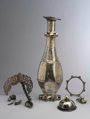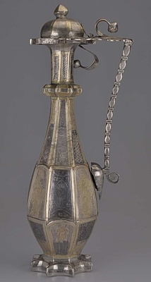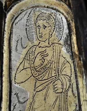 Das Bildnis eines Mannes mit Heiligenschein gehört zum Dekor dieser reich verzierten Silberkanne. Auf ihrem schlanken Körper von achteckigem Querschnitt sind Figuren und Ornamente einziseliert. Einlagen in anthrazitfarbenem Niello (Silber und Kupfer mit Schwefel) und vergoldete Flächen bestimmen den Charakter des Gefäßes. Durch Rahmen und Linien sind auf dem Kannenkörper auf jeder der acht Seiten fünf übereinander liegende Felder abgeteilt. Vier im Bereich des größten Gefäßdurchmessers zeigen stehende Männer, bekleidet mit Tunika und Mantel. Je zwei wenden sich einander gestikulierend zu. Vier wesentlich kleinere Männer zeigt die darunter liegende Zone. Unmittelbar über dem Fuß sind vier Schafe dargestellt. Allen Figuren gemeinsam ist der Heiligenschein. Dieser und die Anzahl zwölf legen nahe, dass hier die Apostel gemeint sind, vier von ihnen in symbolischer Darstellung in Gestalt von Schafen.